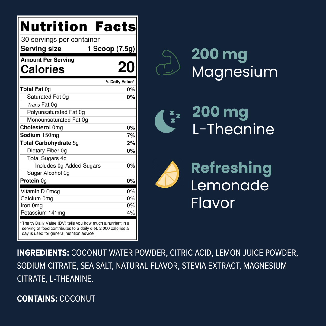 A crisp, lightly sweet lemonade crafted for your evening routine. Made with real lemon juice powder, magnesium, and L-theanine, this refreshing blend is designed to help you unwind — without added sugar, grogginess, or the sugar crash. Just scoop, stir, and sip your way to a calmer night.